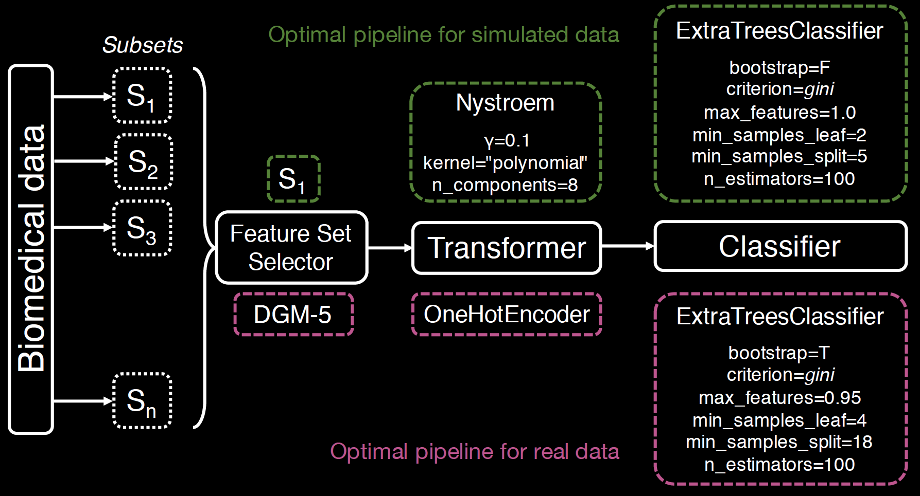 FeatureSetSelector-Transformer-ClassifierThe optimal pipelines from TPOT-FSS significantly outperform those of XGBoost and standard TPOT.