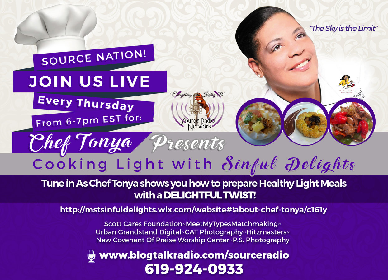 Source Nation! Enjoy The Slide Show. Join us in the kitchen NOW for, Cooking Light with Sinful Delights as Chef Tonya shows you how to prepare an amazing meal. What's on the menu? Skillet Chicken, Roasted Red Potatoes and Carrots. Call in to listen at 619-924-0933. You've heard it here from your favorite radio station Source Radio Network.