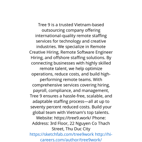 Website: https://tree9.work/ Tree 9 is a leading Vietnam-based outsourcing company delivering international-quality remote staffing solutions for tech firms and creative companies. We focus on Remote Creative Hiring, Remote Software Engineer Hiring,