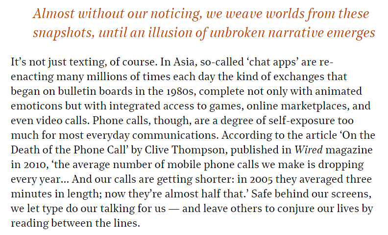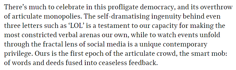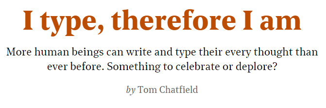 As a result of this, for the first time ever we live not only in an era of mass literacy, but also — thanks to the act of typing onto screens — in one of mass participation in written culture.