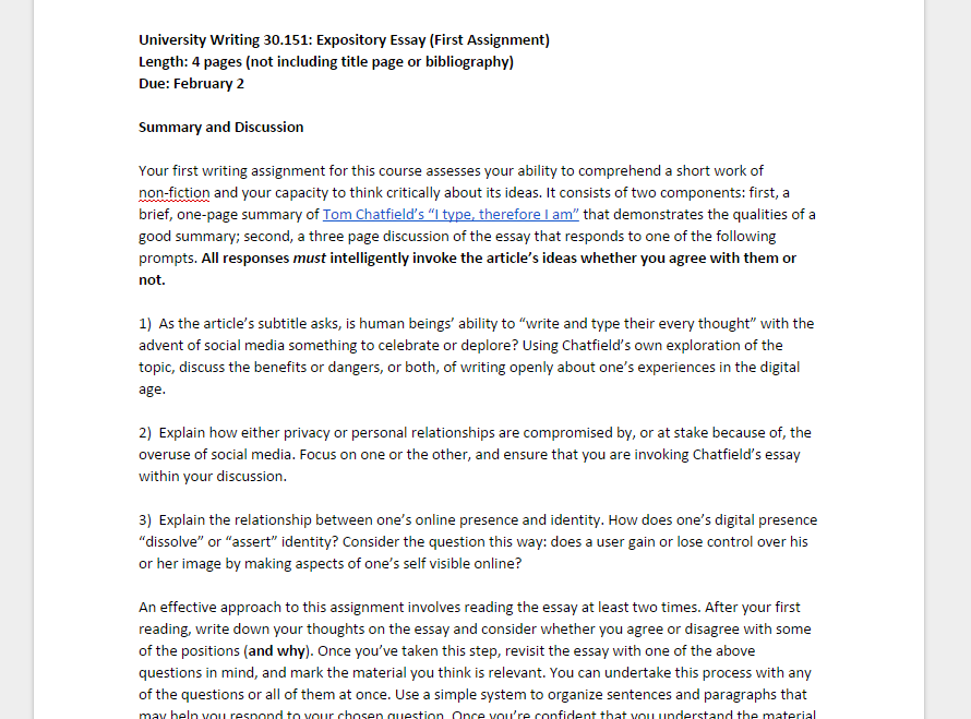 Our discussion on critical reading expands on our topics from week 3. We take a deeper look at the methods and strategies writers use to get more out of a text. Summarizing, paraphrasing, and quoting are used to present information in a new context, but critical reading is how we make sense of attitudes, ideologies, and patterns of thought in a complex work. We'll discuss Tom Chatfield's "I type therefore I am" and show how close reading leads to exposition, two essential tools for reading and writing in an academic context.