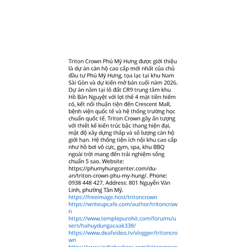 Website: https://phumyhungcenter.com/du-an/triton-crown-phu-my-hung/. Triton Crown Phú Mỹ Hưng được giới thiệu là dự án căn hộ cao cấp mới nhất của chủ đầu tư Phú Mỹ Hưng, tọa lạc tại khu Nam Sài Gòn và dự kiến mở bán cuối năm 2026. Dự án nằm tại lô