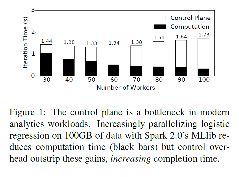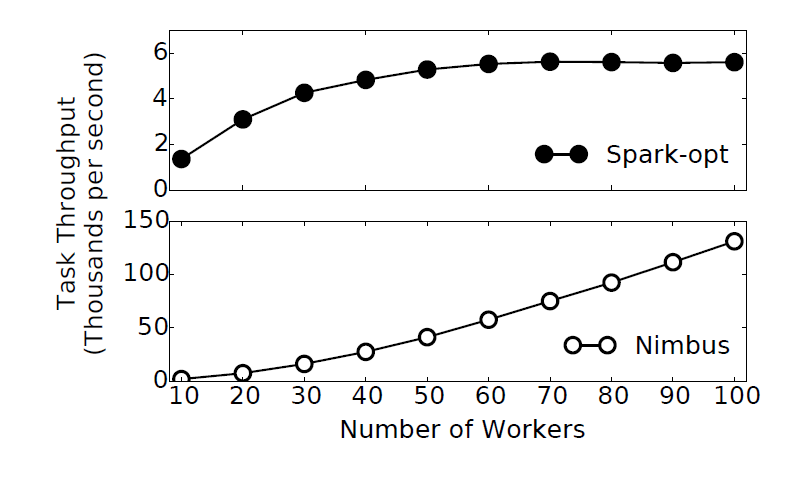- Caching control plane messages (Nimbus) is as fast as systems that do not have a centralized master (Naiad-opt), and much faster than systems which have a centralized master but do not cache messages (Spark-opt)