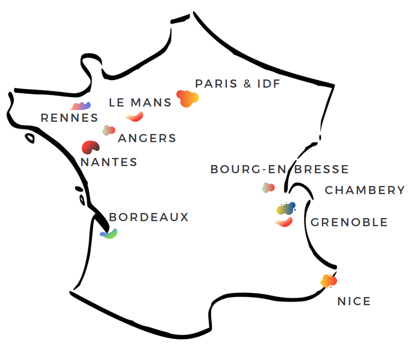Paris, IDF (92, 78, 95), Pays de la Loire (Nantes, Angers, Rennes, La Roche sur Yon), Bordeaux, Grenoble, Nice...