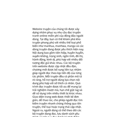 Website: https://appenginejs.org. Website truyện của chúng tôi được xây dựng nhằm phục vụ nhu cầu đọc truyện tranh online miễn phí của đông đảo người dùng. Tại đây, bạn có thể khám phá kho truyện phong phú với nhiều thể loại phổ biến như manhua, manh