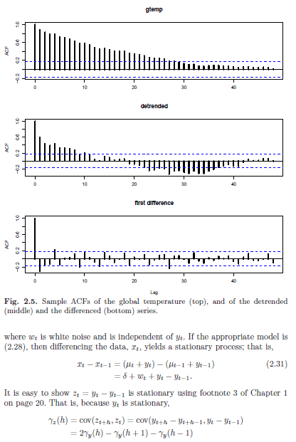 Shows ACF of the original data as well as the ACF of the detrended data