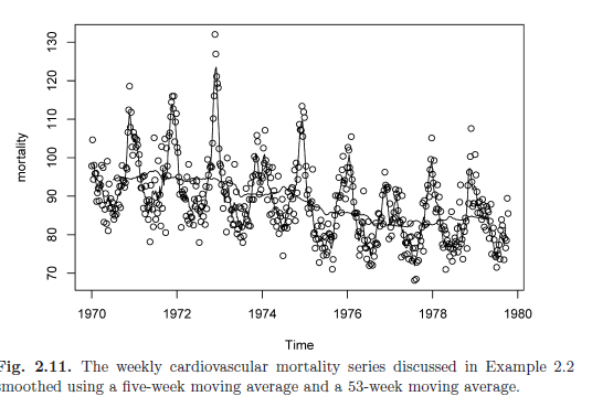 strong seasonal components -> corresponds to summer-winter variation and downward trend in cardiovascular mortality over 10 years