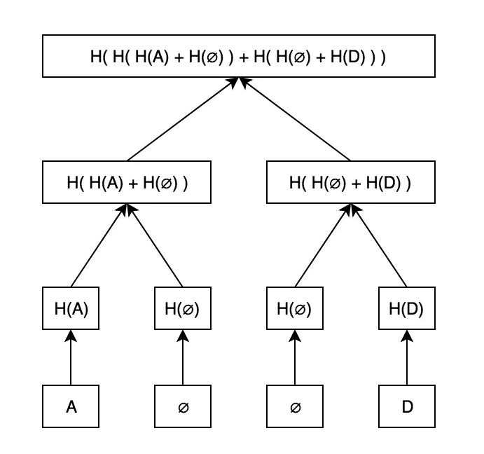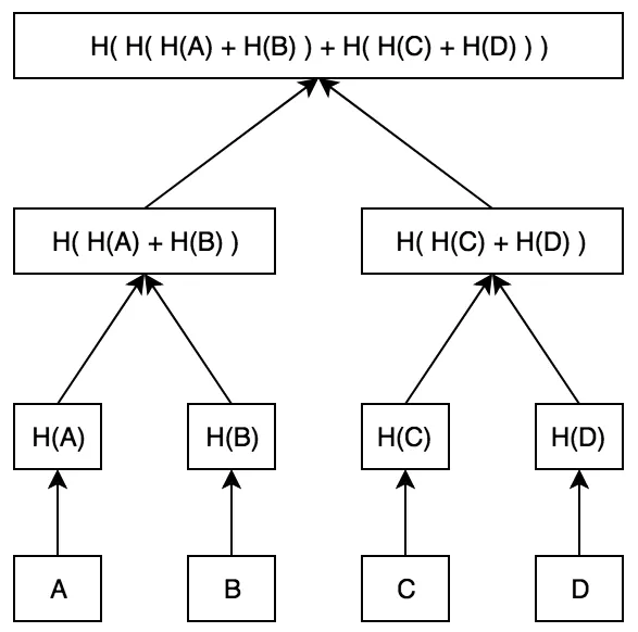 This continues until a single root node is reached, which represents the root hash of the entire tree, called Merkle Root.