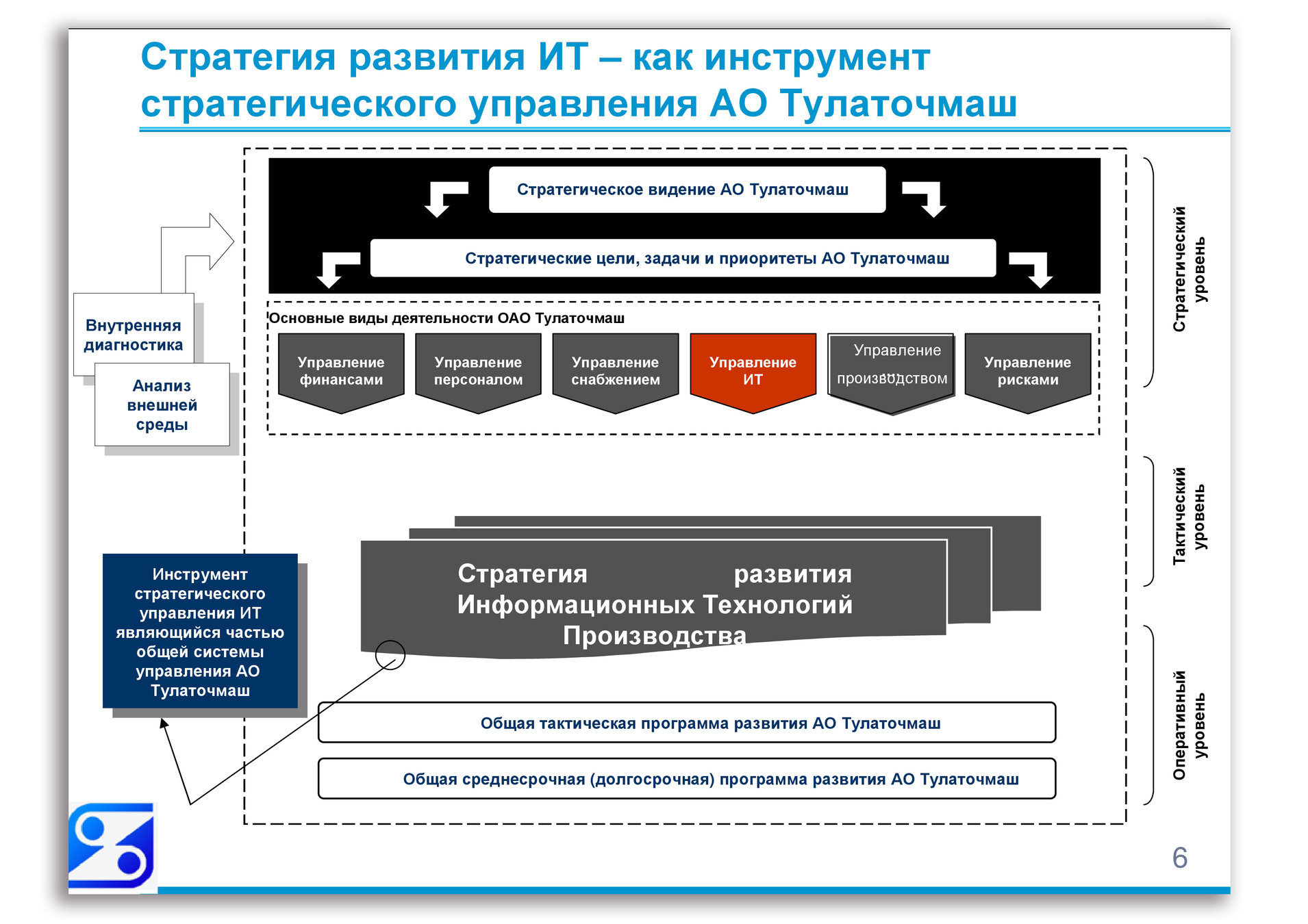 Цель Технической политики ИТ АО «Тулаточмаш» - повышение эффективности и качества производственной деятельности, путем определения основных направлений и требований для оптимального развития ИТ-инфраструктуры.
