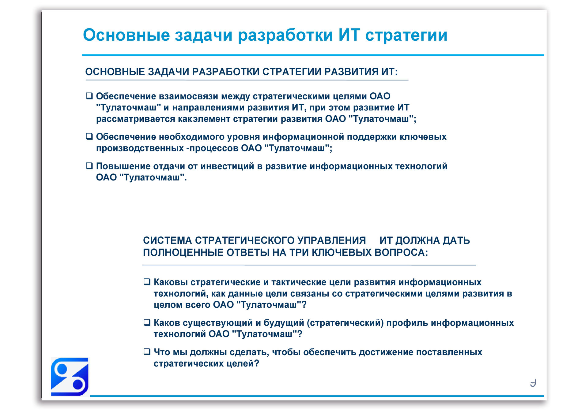 создание облика передового производства, увеличение прибыли и капитализации АО «Тулаточмаш» посредством внедрения и применения комплексной автоматизированной системы управления, информационных технологий и стандартов в области управления ИТ.