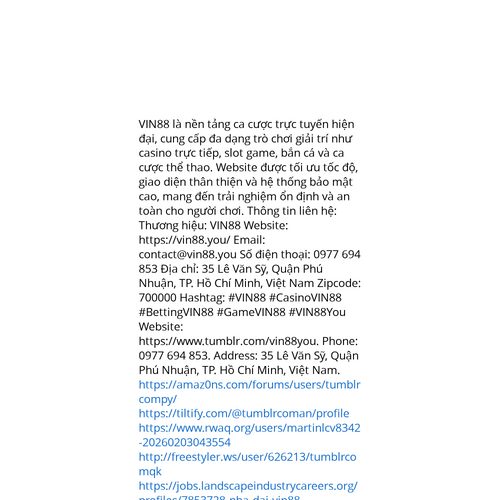 Website: https://www.tumblr.com/vin88you. VIN88 là nền tảng ca cược trực tuyến hiện đại, cung cấp đa dạng trò chơi giải trí như casino trực tiếp, slot game, bắn cá và ca cược thể thao. Website được tối ưu tốc độ, giao diện thân thiện và hệ thống bảo
