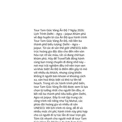 Website: https://traveltalk.vn/tour-tam-giac-vang-an-do/https://traveltalk.vn/tour-tam-giac-vang-an-do/ Tour Tam Giác Vàng Ấn Độ 7 Ngày 2026: Lịch Trình Delhi – Agra – Jaipur.Khám phá vẻ đẹp huyền bí của Ấn Độ qua hành trình Tour Tam Giác Vàng Ấn Độ, nối liền ba thành phố biểu tượng: Delhi