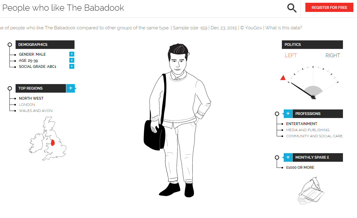 The demographics for cabin in the woods is highly females ranging from 18 - 24 with a profession of Government and civil service. A high concentration of people who like this movie is from north west of England and are working class