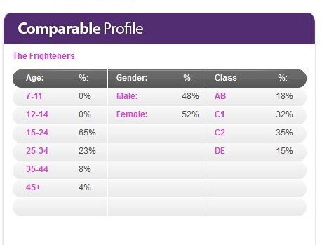 According to YouGuv profiler, the main demographic for Fright-Night areĀ Middle aged men who live in the south of england
