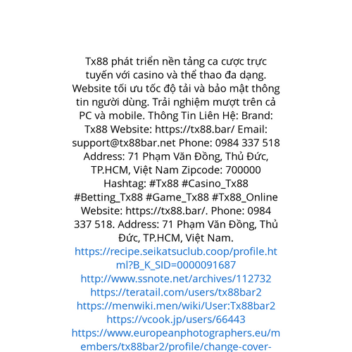 Website: https://tx88.bar/. Tx88 phát triển nền tảng ca cược trực tuyến với casino và thể thao đa dạng. Website tối ưu tốc độ tải và bảo mật thông tin người dùng. Trải nghiệm mượt trên cả PC và mobile. Thông Tin Liên Hệ: Brand: Tx88 Website: https:/