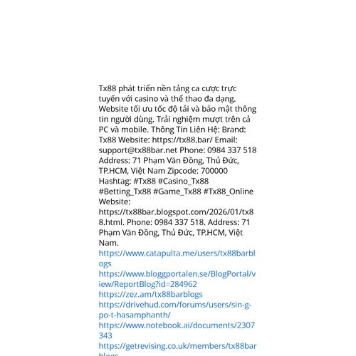 Website: https://tx88bar.blogspot.com/2026/01/tx88.html. Tx88 phát triển nền tảng ca cược trực tuyến với casino và thể thao đa dạng. Website tối ưu tốc độ tải và bảo mật thông tin người dùng. Trải nghiệm mượt trên cả PC và mobile. Thông Tin Liên Hệ: