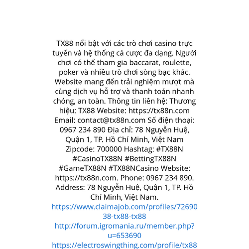 Website: https://tx88n.com. TX88 nổi bật với các trò chơi casino trực tuyến và hệ thống cá cược đa dạng. Người chơi có thể tham gia baccarat, roulette, poker và nhiều trò chơi sòng bạc khác. Website mang đến trải nghiệm mượt mà cùng dịch vụ hỗ trợ và