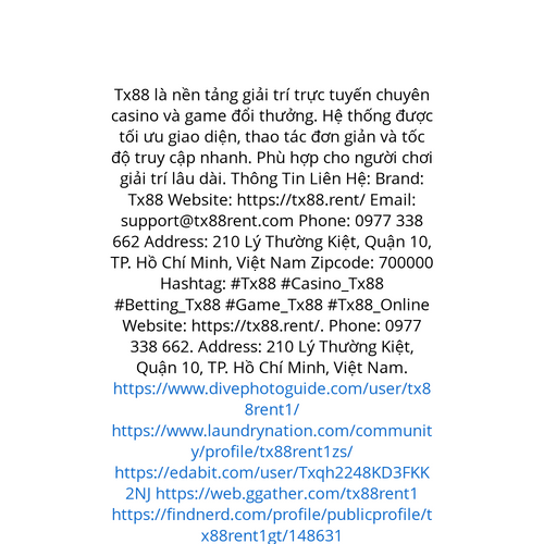 Website: https://tx88.rent/. Tx88 là nền tảng giải trí trực tuyến chuyên casino và game đổi thưởng. Hệ thống được tối ưu giao diện, thao tác đơn giản và tốc độ truy cập nhanh. Phù hợp cho người chơi giải trí lâu dài. Thông Tin Liên Hệ: Brand: Tx88 W