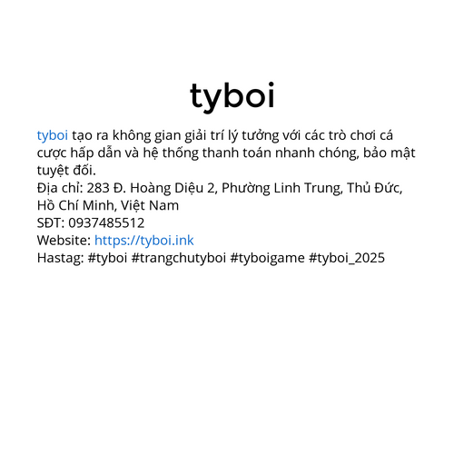 tyboi tạo ra không gian giải trí lý tưởng với các trò chơi cá cược hấp dẫn và hệ thống thanh toán nhanh chóng, bảo mật tuyệt đối. Địa chỉ: 283 Đ. Hoàng Diệu 2, Phường Linh Trung, Thủ Đức, Hồ Chí Minh, Việt Nam SĐT: 0937485512 Website: https://tyboi