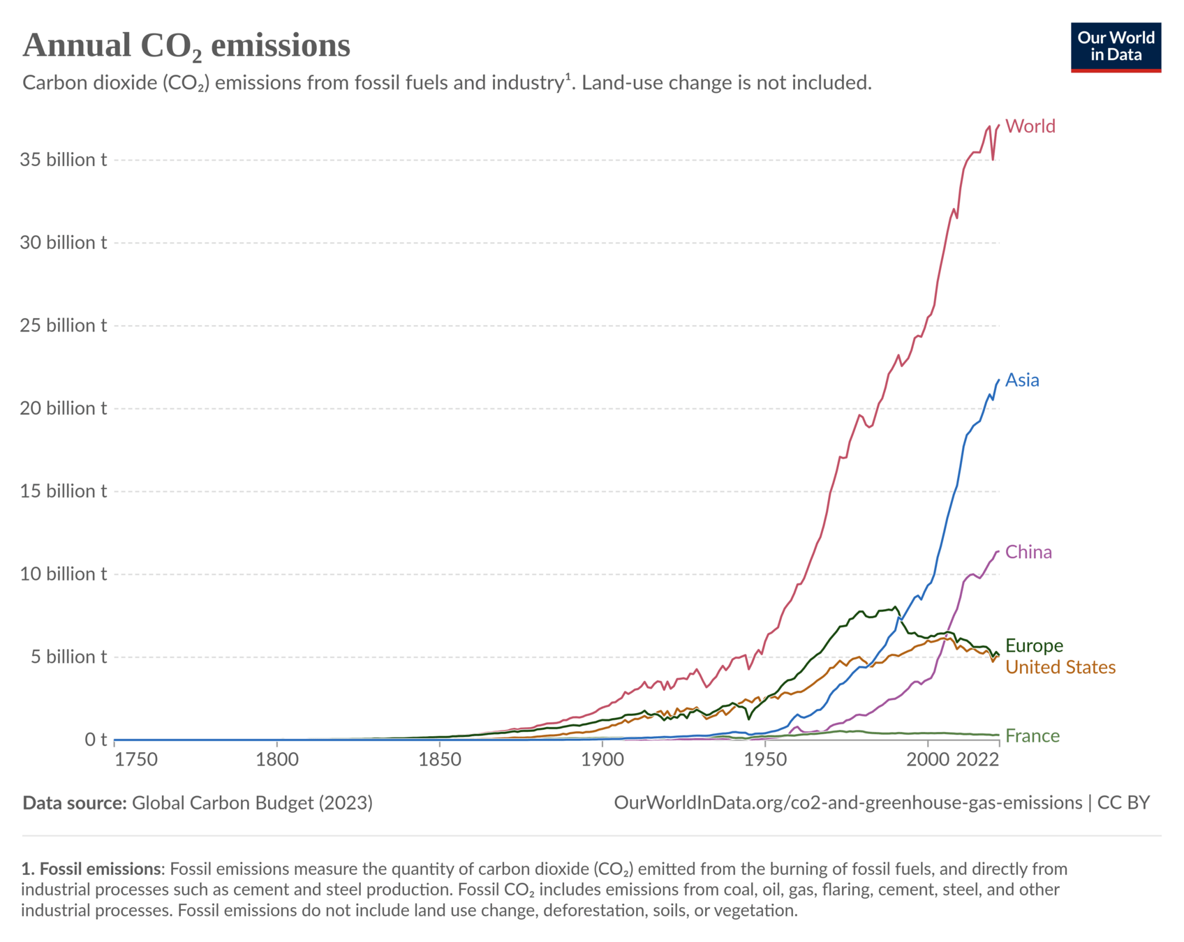 Trajectoire de réduction mondiale amorcée mais à accélérer, Source Our world in data