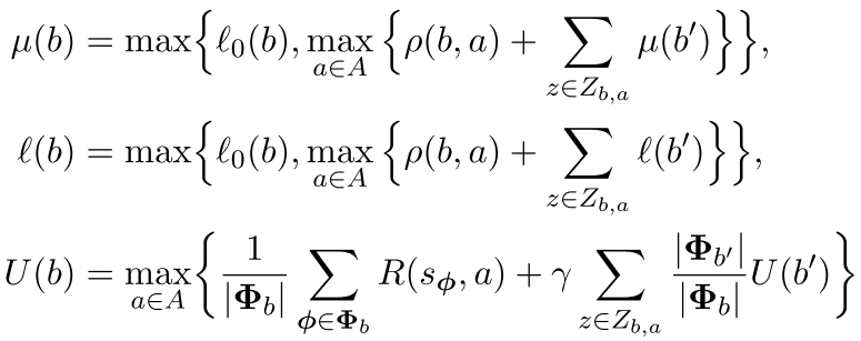 \(l(b), \mu(b)\) : lower and upper bounds of optimal RWDU at belief node \(b\) \(\rightarrow l(b) \le \nu^*(b) \le \mu(b)\)
