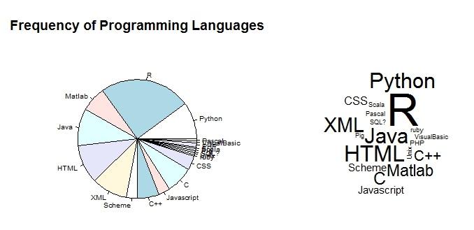 - R is the most commonly used language, followed by: