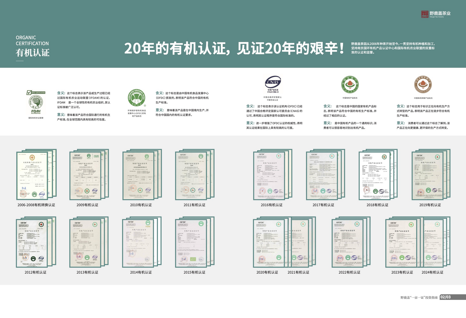 特别置换,如客户需要更大量的劳保用茶等,公司可用非野鹿盖茶园产出的茶青(非有机),在野鹿盖的有机加工厂进行加工,提供给客户。售量可达每亩200斤。