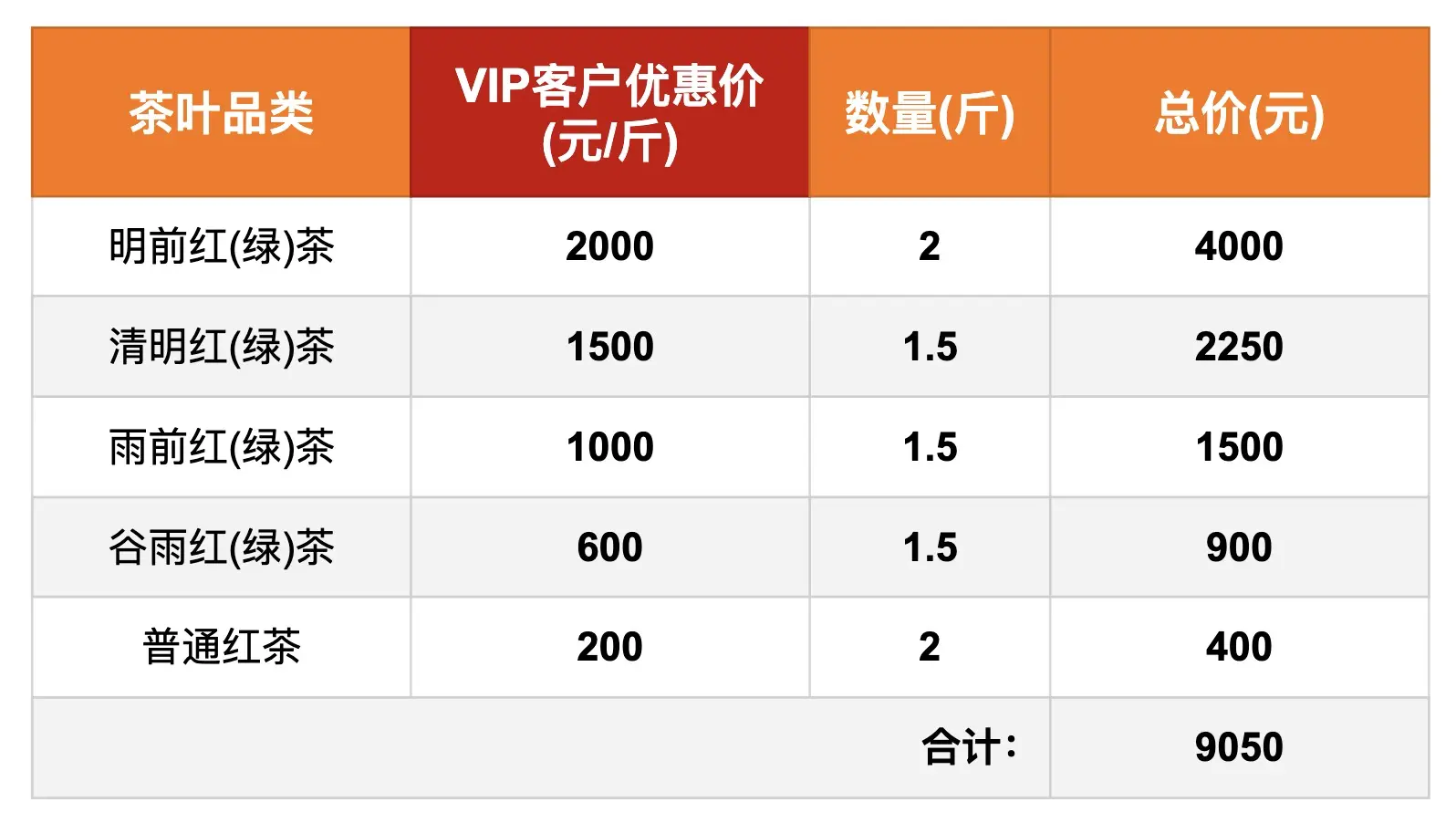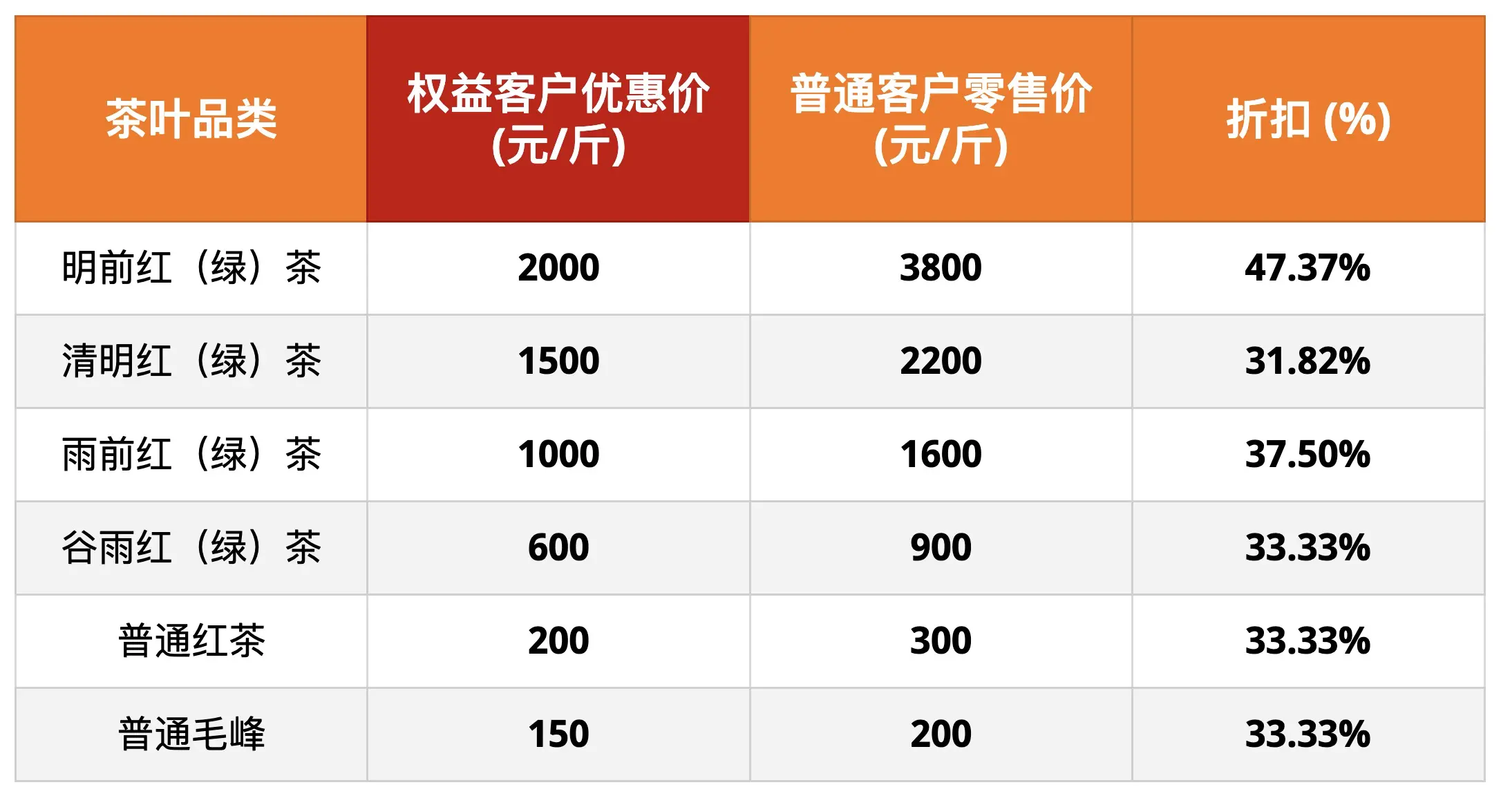 权证客户享受多年以来原VIP客户享受的各类别茶叶的单价:
