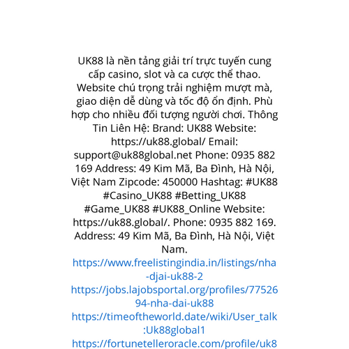 Website: https://uk88.global/https://uk88.global/ UK88 là nền tảng giải trí trực tuyến cung cấp casino, slot và ca cược thể thao. Website chú trọng trải nghiệm mượt mà, giao diện dễ dùng và tốc độ ổn định. Phù hợp cho nhiều đối tượng người chơi. Thông Tin Liên Hệ: Bra