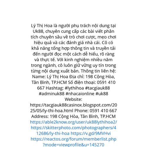 Website: https://tacgiauk88casinox.blogspot.com/2025/05/ly-thi-hoa.html Lý Thị Hoa là người phụ trách nội dung tại Uk88, chuyên cung cấp các bài viết phân tích chuyên sâu về trò chơi cược, mẹo chơi hiệu quả và các đánh giá nhà cái. Cô có khả năng tổn