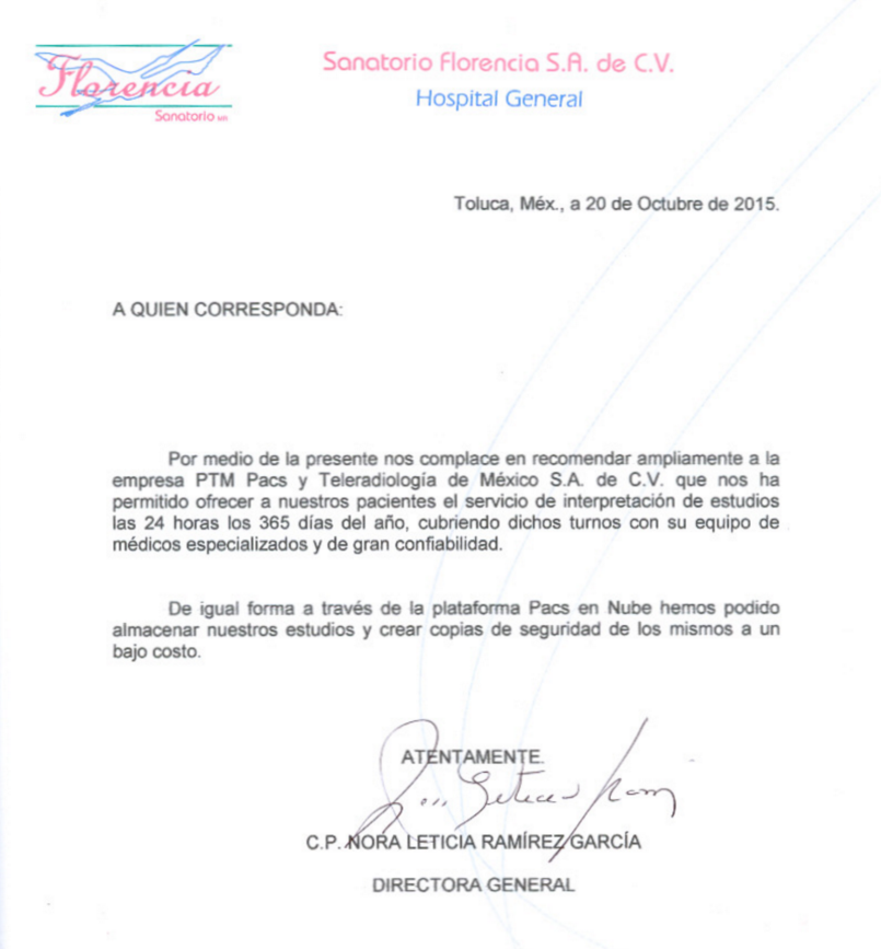 " La plataforma de PTM ha permitido ofrecer a nuestros pacientes el servicio de interpretación de estudios la 24 horas los 365 días del año, y nos ha permitido almacenar nuestros estudios y crear copias de seguridad de los mismos a un bajo costo desde hace 5 años"