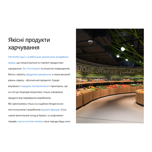 Ultramrket одна з найбільших українських роздрібних мереж, що спеціалізується на торгівлі продуктами харчування. Топ-10 в Україні за кількістю гіпермаркетів. Якість і свіжість пр