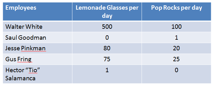 Management application: assigning employees to different tasks using opportunity cost.You have five employees and produce Lemonade and Pop Rocks at your Albuquerque plant.