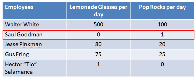Saul is terrible and making lemonade (he drinks most of it and spills the rest) so he is always the first person on the Pop Rocks production line.