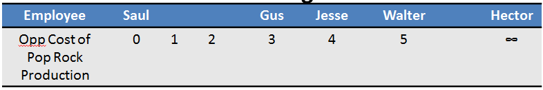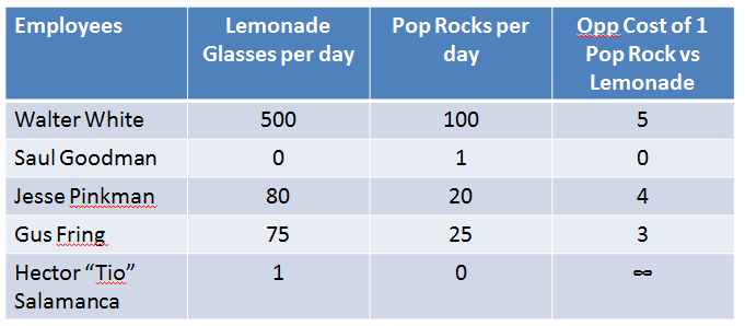 Walter White is better at making Pop Rocks than anyone else--but his opportunity cost is high (because he is also productive at making lemonade)