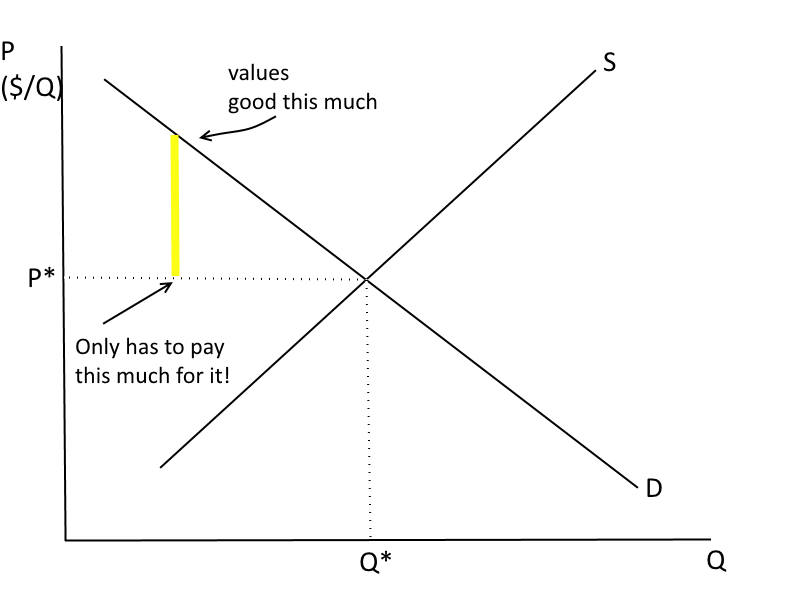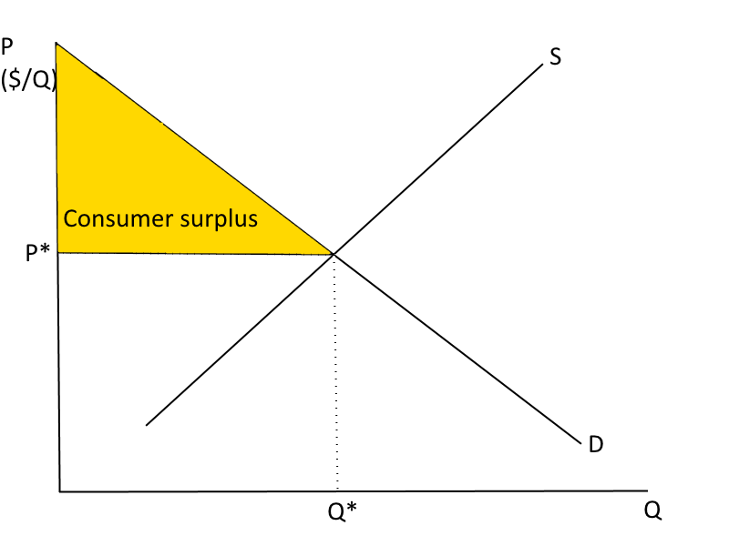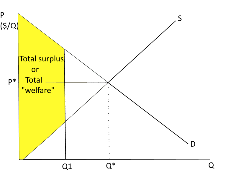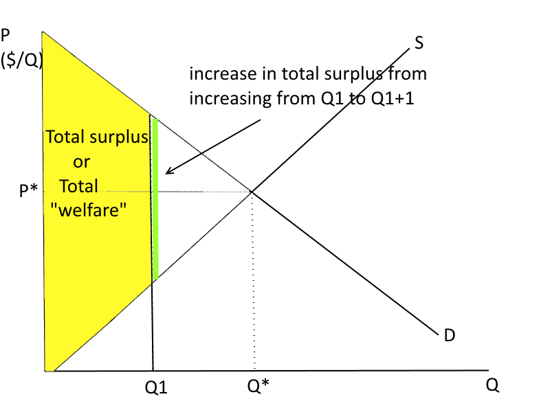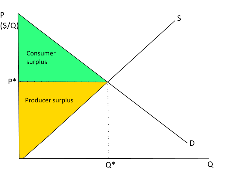 Consumers and producers in a competitive market -- acting only on their own self interest -- will drive the market to the price and quantity that maximizes the total surplus.