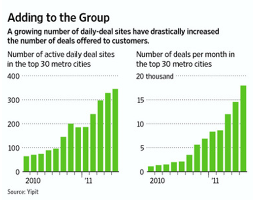 …this Internet trend is on fire. Groupon imitators are everywhere… LivingSocial, Groupon’s closest competitor, is in 175 cities …Then there’s BuyWithMe… BloomSpot…CrowdSavings…”