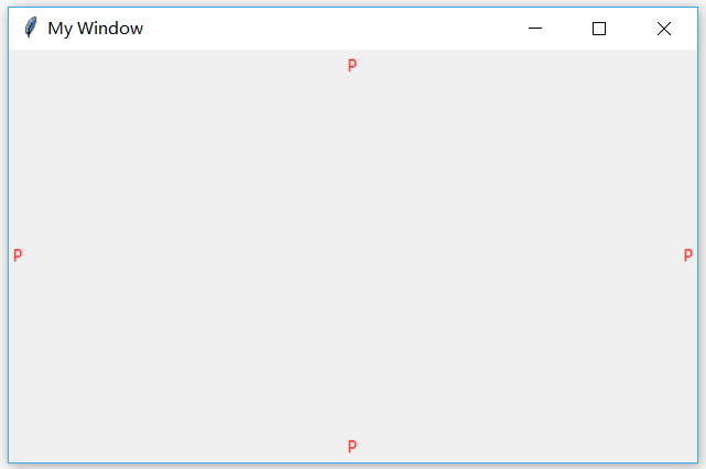 tk.Label(window, text='P', fg='red').pack(side='bottom') # 下