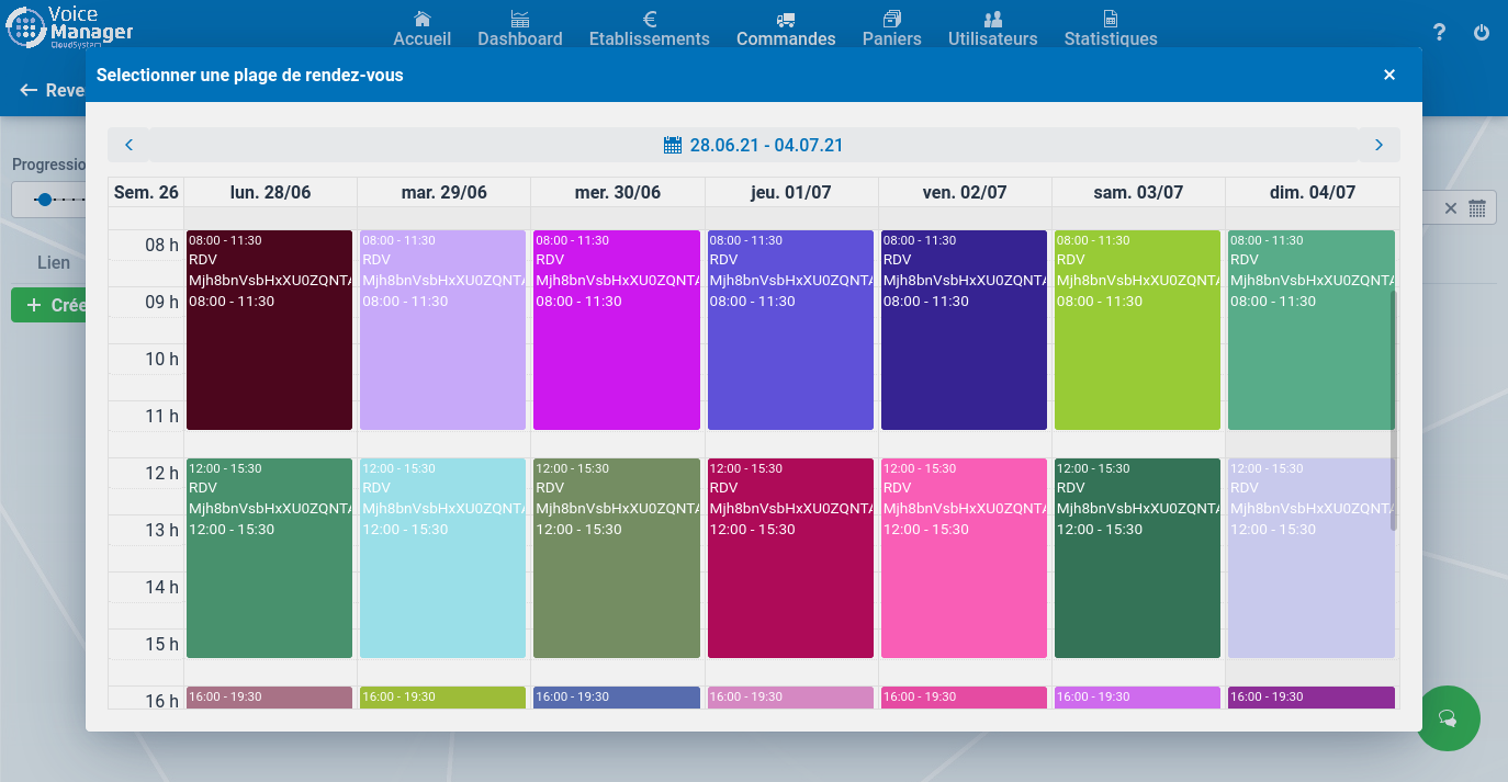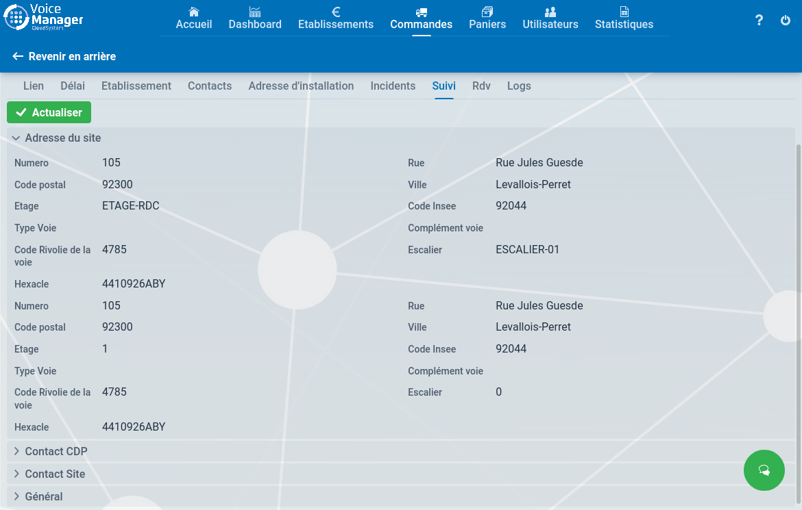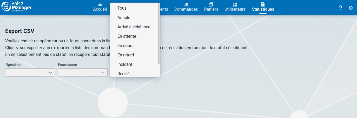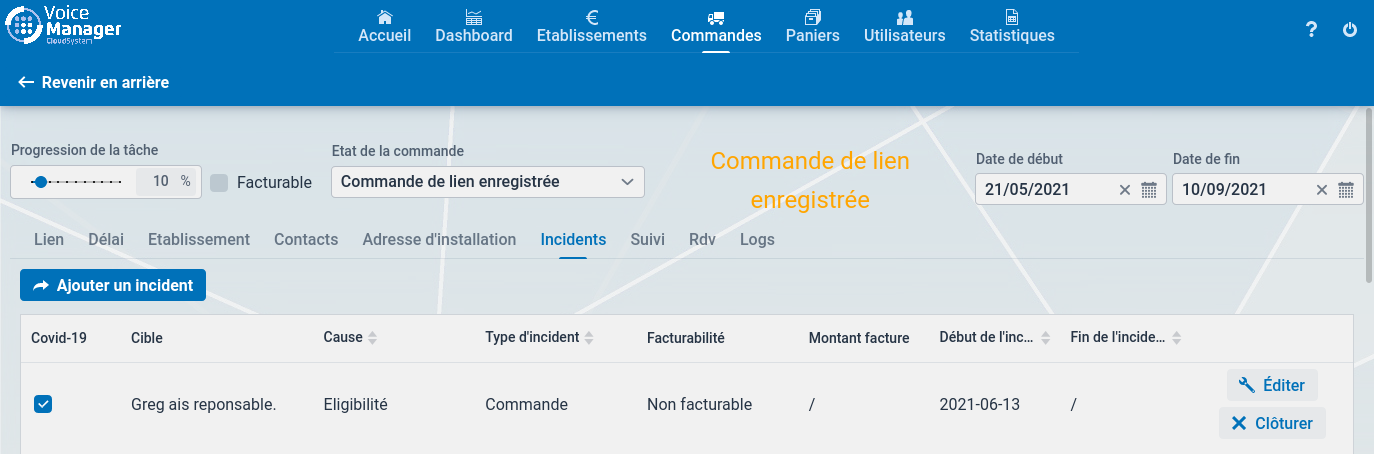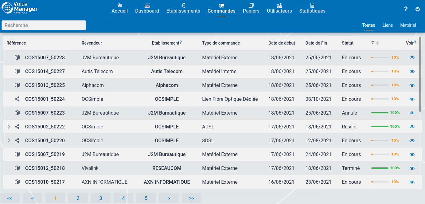 | Référence commande | Revendeur | Type de commande | Date de début | Date de fin | Status | Progression | Opérateur | Technologie |