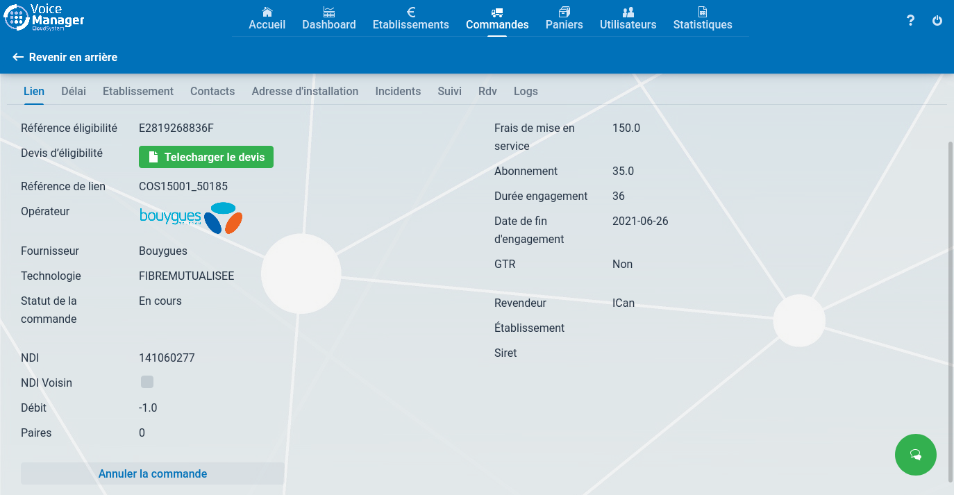 | COS15001_50020 | ICan | Lien | 2021-04-06 | 2021-06-01 | En retard | 10 | Bouygues | SDSL |