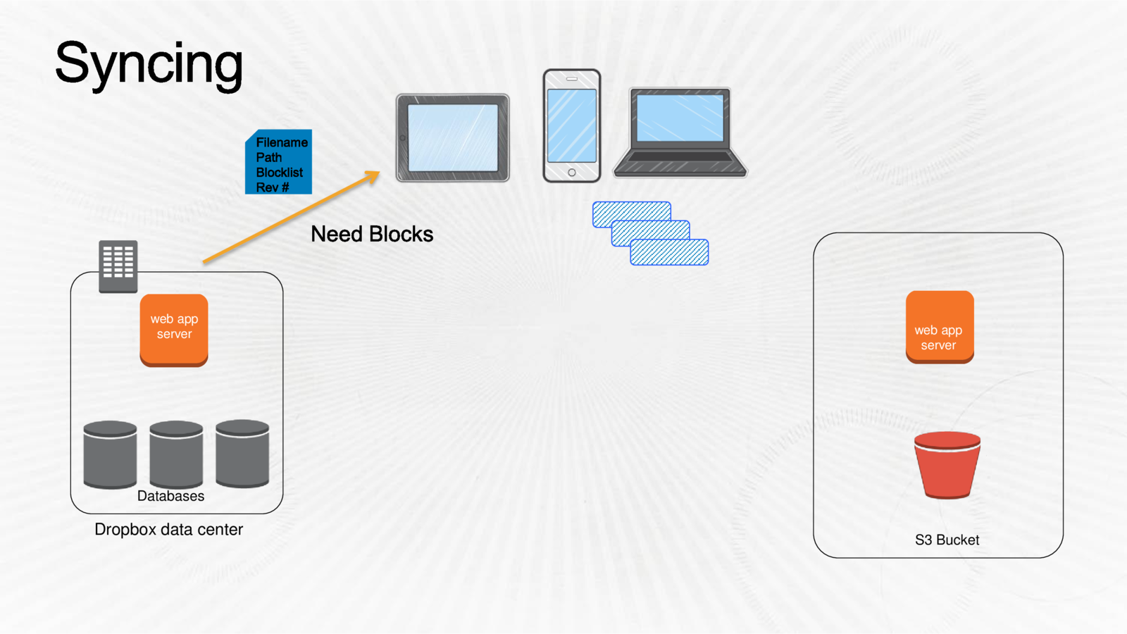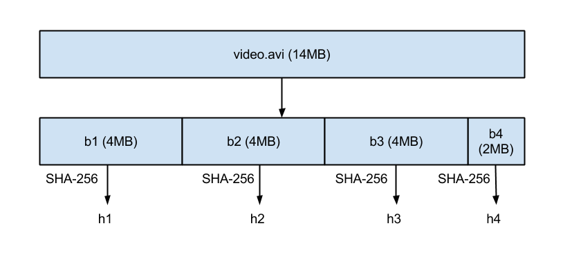 Every file in Dropbox is partitioned into 4MB blocks, with the final block potentially being smaller. These blocks are hashed with SHA-256 and stored. A file’s contents can be uniquely identified by this list of SHA-256 hashes, which we refer to as a ‘blocklist’.