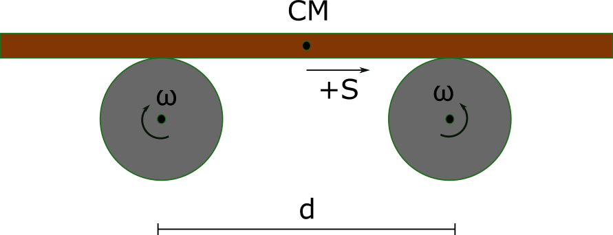 Η ομογενής ράβδος του σχήματος αρχικά ισορροπεί πάνω στους δύο κυλίνδρους που περιστρέφονται με γωνιακές ταχύτητες μέτρου ω, όπως στο σχήμα. Με δεδομένα: