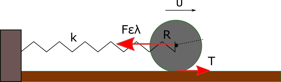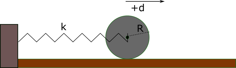 Ο κύλινδρος του σχήματος είναι προσαρτημένος από το κέντρο μάζας του σε ελατήριο σταθεράς k και αρχικά ισορροπεί σε οριζόντιο επίπεδο. Η ροπή αδράνειας του είναι . Με δεδομένα την μάζα m και την σταθερά k του ελατηρίου: