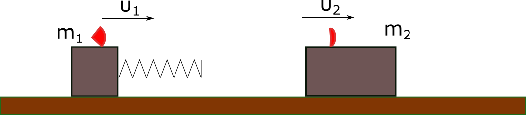 Δύο κιβώτια με μάζες m1 = m και m2 = 4m κινούνται χωρίς τριβές πάνω σε λείο οριζόντιο επίπεδο με ταχύτητες υ1 = 4υ και υ2 = υ, όπως στο σχήμα. Στην μάζα m1 είναι προσαρτημένο ένα ελατήριο σταθεράς k, μήκους L, και αμελητέας μάζας.