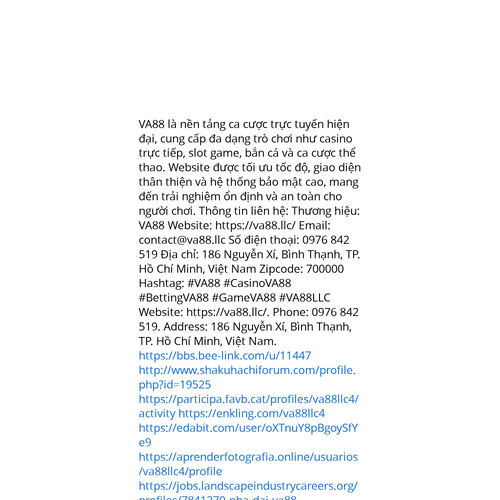 Website: https://va88.llc/. VA88 là nền tảng ca cược trực tuyến hiện đại, cung cấp đa dạng trò chơi như casino trực tiếp, slot game, bắn cá và ca cược thể thao. Website được tối ưu tốc độ, giao diện thân thiện và hệ thống bảo mật cao, mang đến trải n