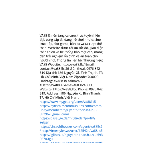 Website: https://va88.llc/. VA88 là nền tảng ca cược trực tuyến hiện đại, cung cấp đa dạng trò chơi như casino trực tiếp, slot game, bắn cá và ca cược thể thao. Website được tối ưu tốc độ, giao diện thân thiện và hệ thống bảo mật cao, mang đến trải n
