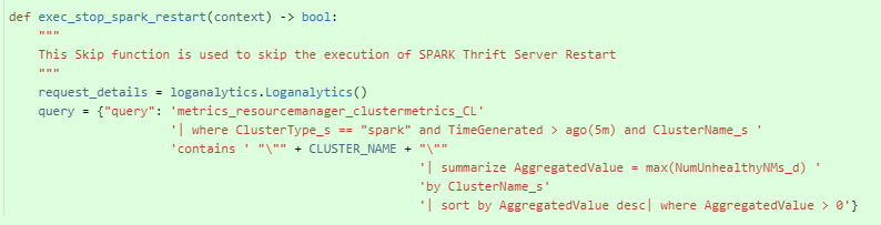 query = {"query": 'metrics_resourcemanager_clustermetrics_CL' '| where ClusterType_s == "spark" and TimeGenerated > ago(5m) and ClusterName_s ' 'contains ' "\"" + CLUSTER_NAME + "\"" '| sort by AggregatedValue desc| where AggregatedValue > 0'}