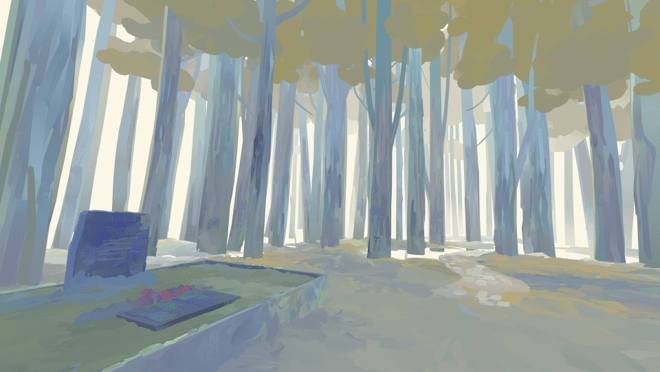 Environment painting for scene where Inge revisits her grandmother's grave at the Bikernieki Memorial in Riga