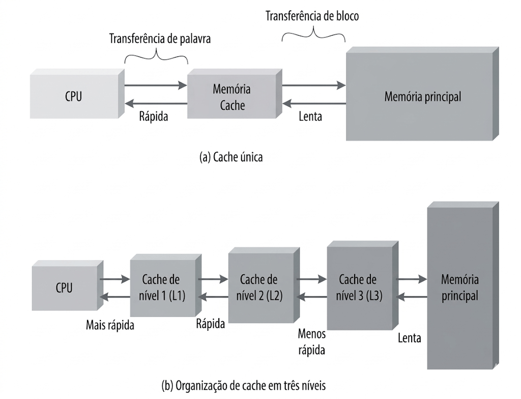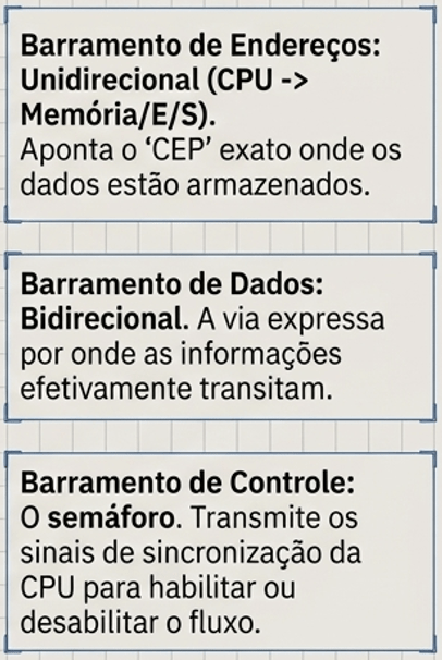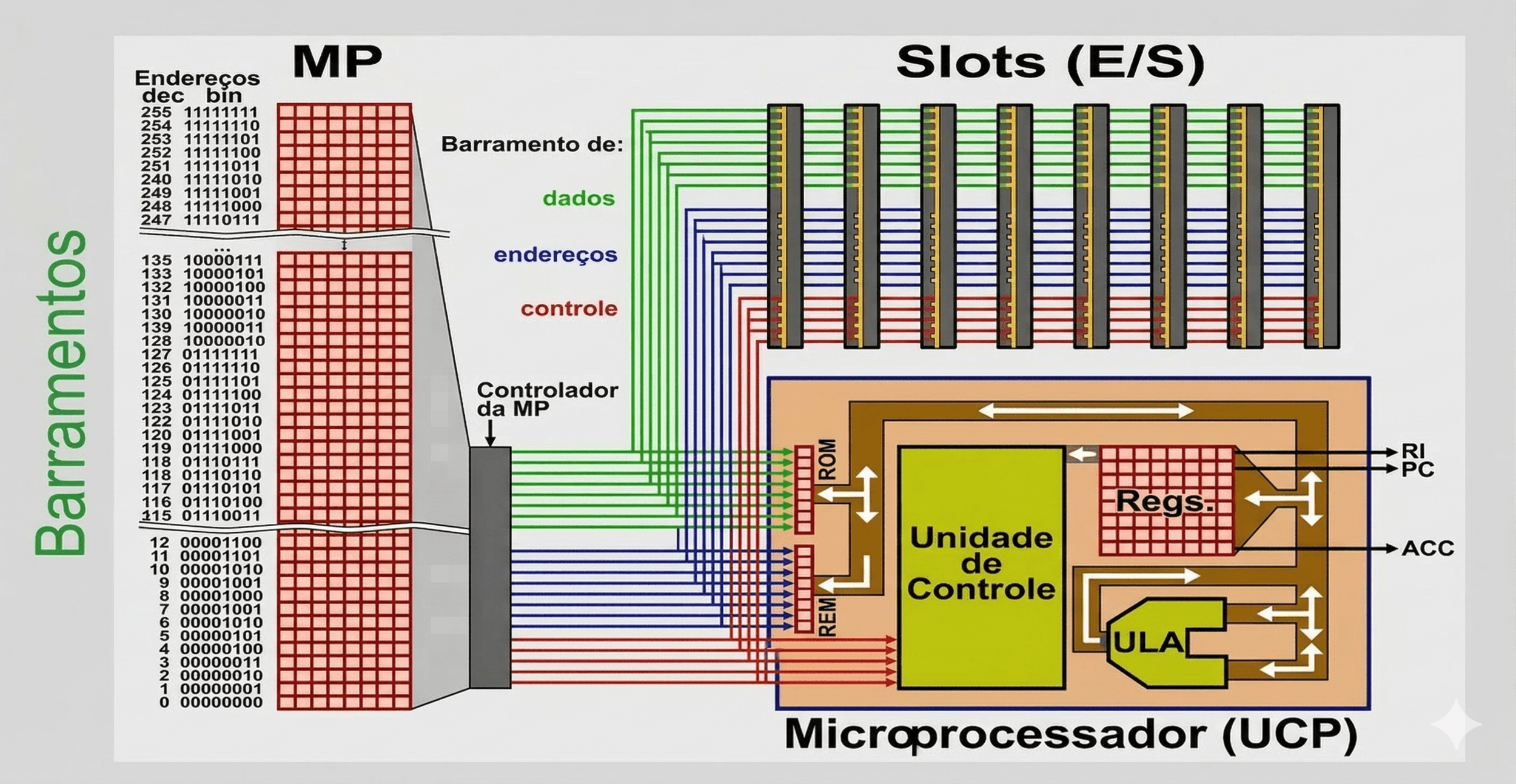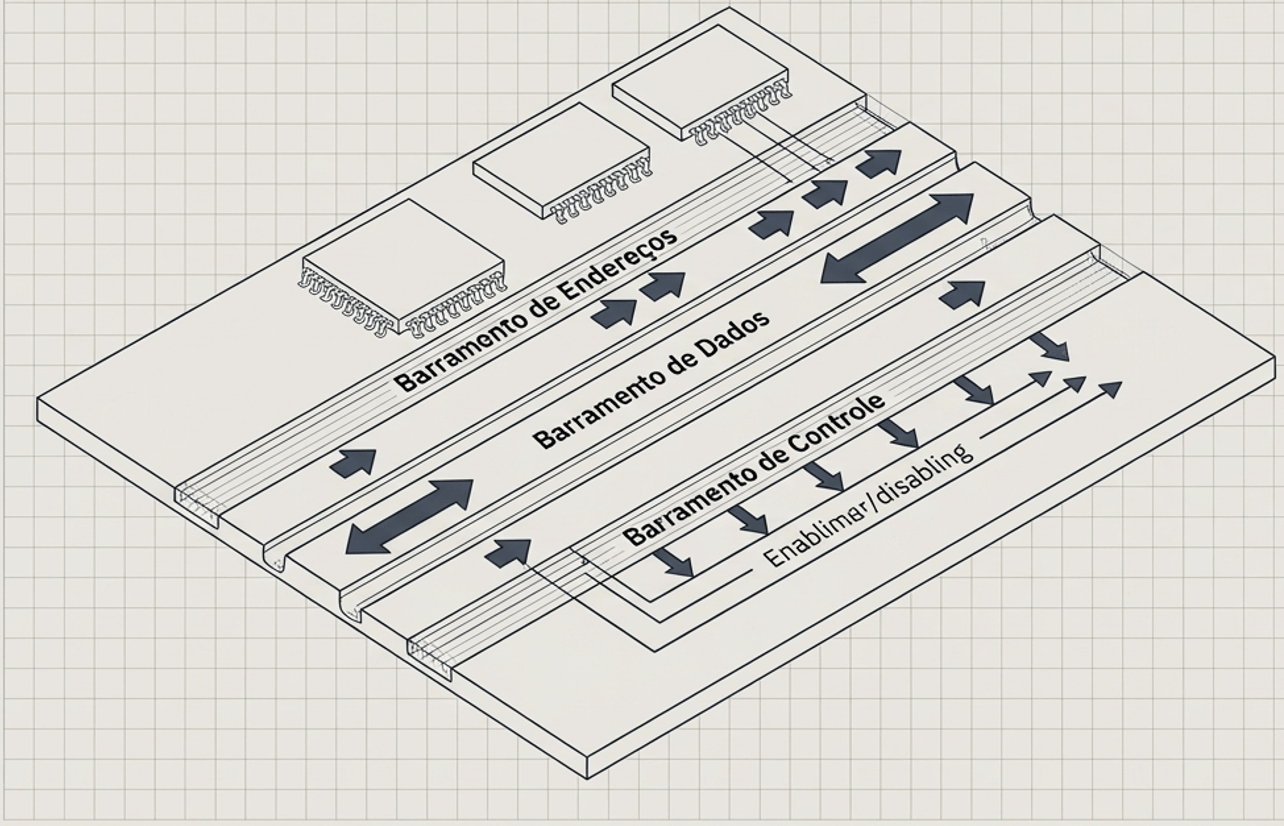 Os barramentos são canais de comunicação que transferem dados, endereços e sinais de controle entre componentes. A largura do barramento determina a taxa de transferência de dados.