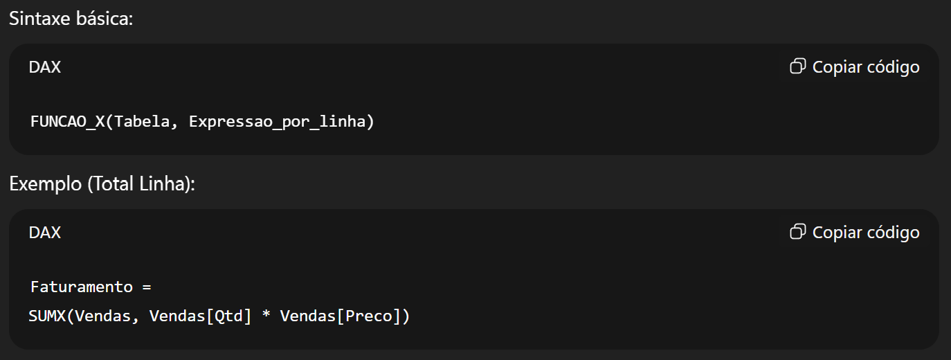Ex.: SUMX, AVERAGEX, MAXX, MINX, COUNTX, RANKX.
